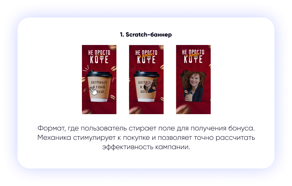 - Значительное увеличение CTR за счет высокой интерактивности форматов.