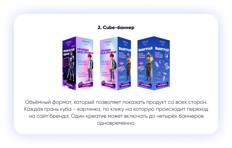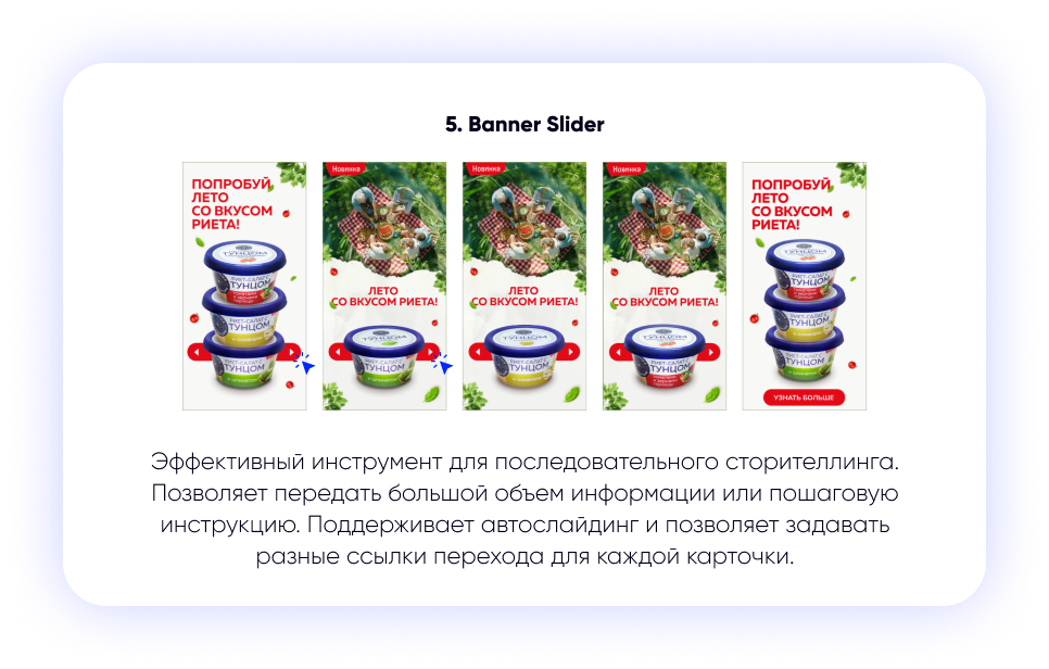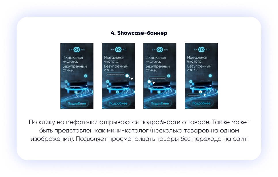 - Специализированное применение: такие форматы, как Showcase-баннер, отлично подходят для задач прямой конверсии, поскольку сокращают путь пользователя до покупки, предлагая мини-каталог внутри блока. Формат Banner Slider идеально подходит для последовательного сторителлинга или пошаговой инструкции.